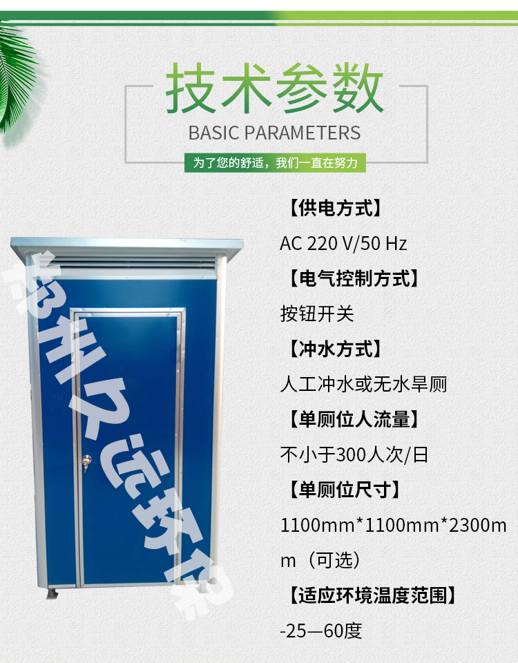 移動(dòng)廁所不受任何工作環(huán)境的限制,外形結(jié)構(gòu)輕巧,顏色搭配合理。 適用于一般城市街道、旅游景區(qū)、公園綠化、車站、碼頭、生活小區(qū)、建筑工地、廣場等人口密集的公共場所及繁華商業(yè)街等場所。 移動(dòng)洗手間具有可移動(dòng)性、方便運(yùn)輸、安裝簡單等優(yōu)點(diǎn)。 移動(dòng)廁所水沖式內(nèi)部配置: 蹲便器、沖水箱、洗手池、排風(fēng)扇、照明開關(guān)、...